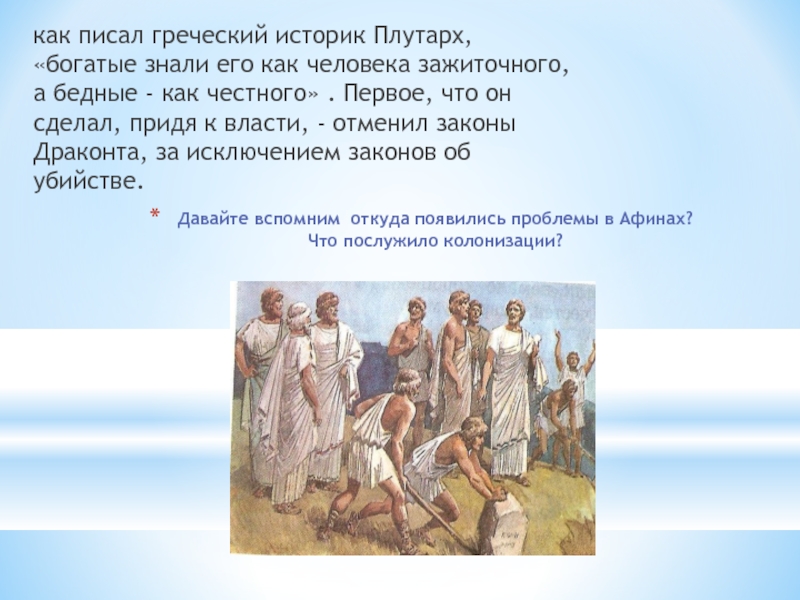 историк Плутарх, «богатые знали его как человека зажиточного, а бедные - как честного» . Первое, что он сделал, придя к власти, - отменил законы Драконта, за исключением законов об убийстве.