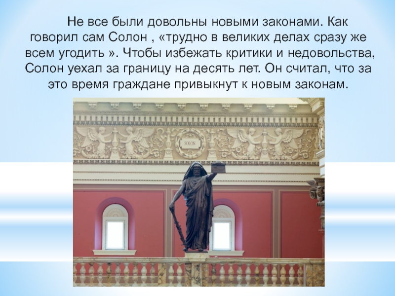 сам Солон , «трудно в великих делах сразу же всем угодить ». Чтобы избежать критики и недовольства, Солон уехал за границу на десять лет. Он считал, что за это время граждане привыкнут к новым законам.