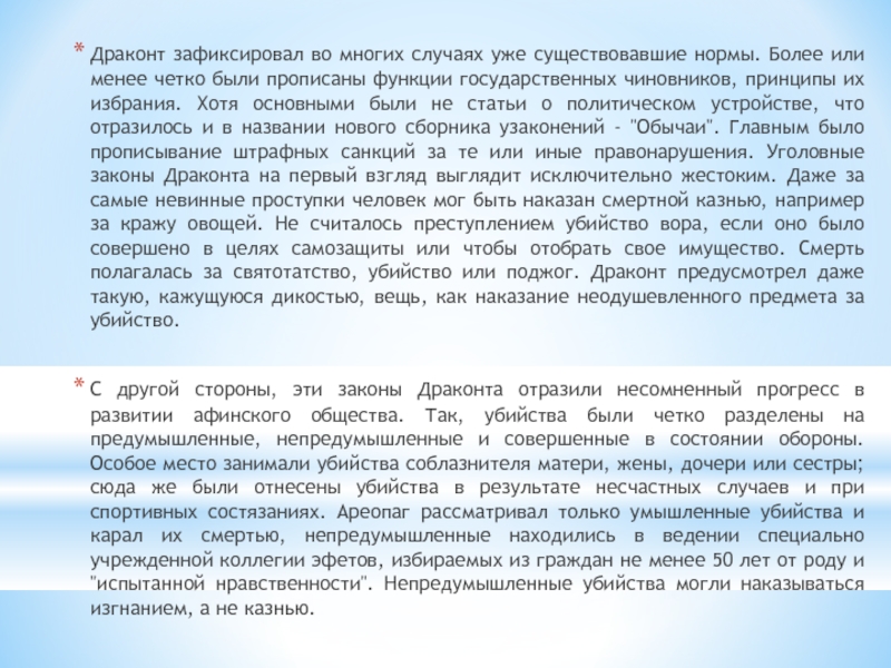 Драконт зафиксировал во многих случаях уже существовавшие нормы. Более или менее