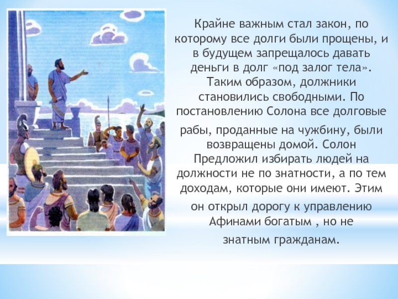 рабы, проданные на чужбину, были возвращены домой. Солон Предложил избирать людей на должности не по знатности, а по тем доходам, которые они имеют. Этим