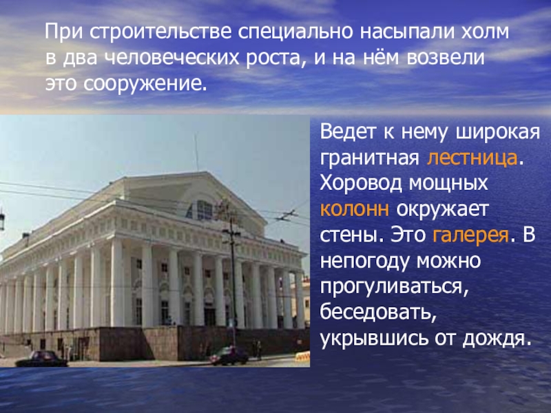 Ведет к нему широкая гранитная лестница. Хоровод мощных колонн окружает стены. Это галерея. В непогоду можно прогуливаться, беседовать, укрывшись от дождя.