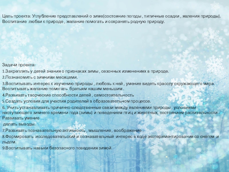 Цель проекта: Углубление представлений о зиме(состояние погоды , типичные осадки , явления природы).Воспитание любви к природе , желание помогать и сохранять родную природу. Задачи проекта:1.Закреплять у детей знания о признаках зимы