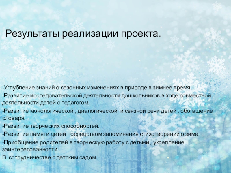 Результаты реализации проекта.-Углубление знаний о сезонных изменениях в природе в зимнее время.-Развитие исследовательской деятельности дошкольников