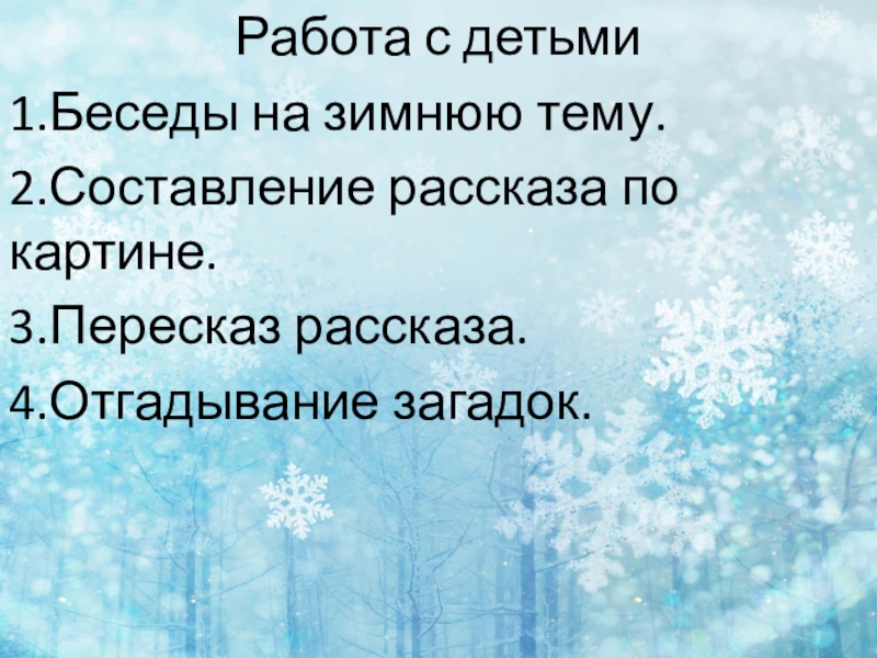 Работа с детьми1.Беседы на зимнюю тему.2.Составление рассказа по картине.3.Пересказ рассказа.4.Отгадывание загадок.
