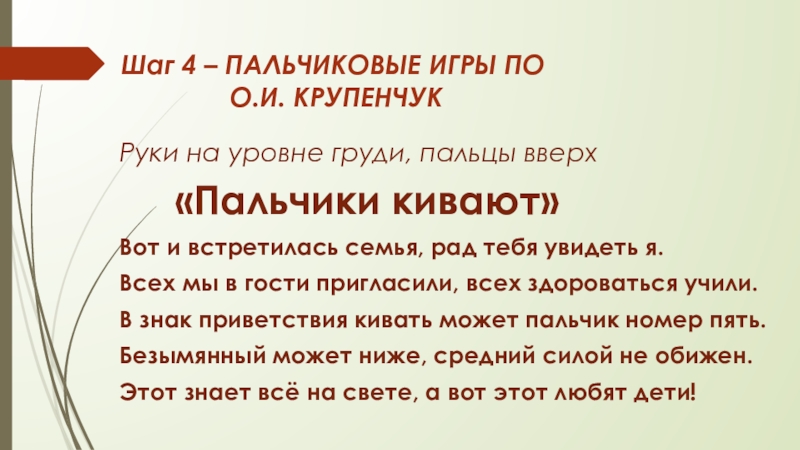 Слайд 5Шаг 4 – Пальчиковые игры по О.И. Крупенчук