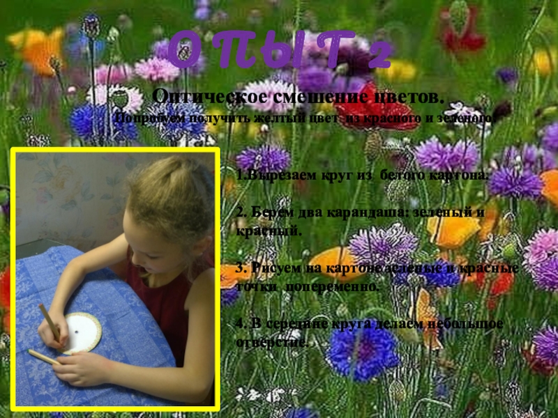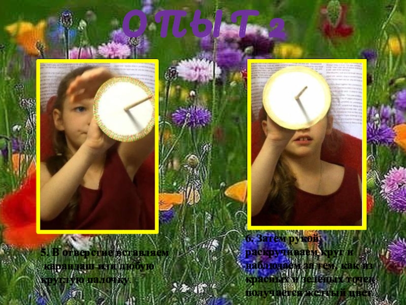 6. Затем рукой раскручиваем круг и наблюдаем за тем, как из красных и зеленых точек получается желтый цвет.