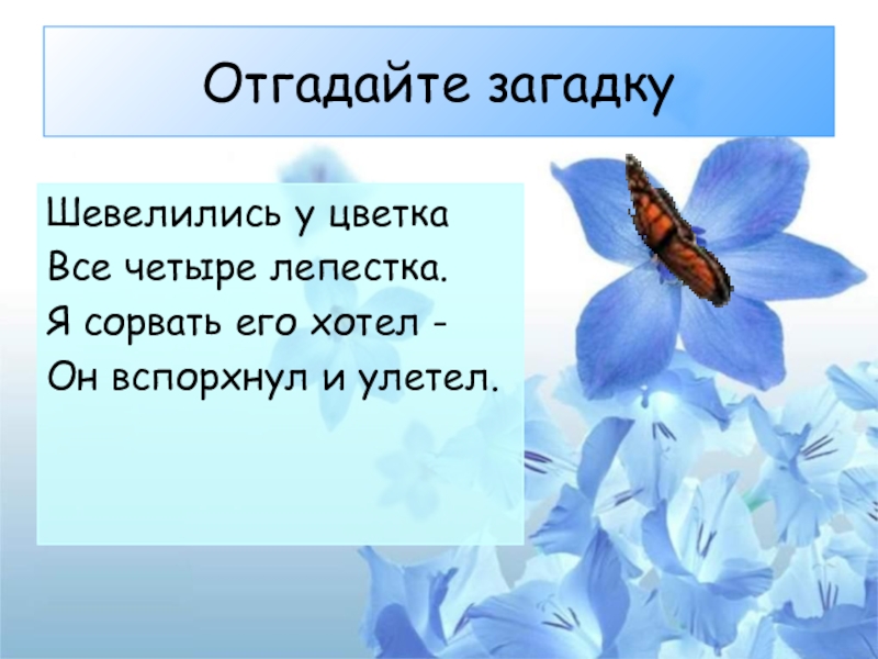 Отгадайте загадкуШевелились у цветкаВсе четыре лепестка.Я сорвать его хотел -Он вспорхнул и улетел.