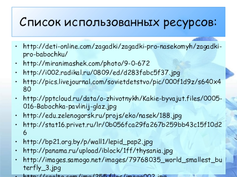 Список использованных ресурсов: http://deti-online.com/zagadki/zagadki-pro-nasekomyh/zagadki-pro-babochku/http://miranimashek.com/photo/9-0-672http://i002.radikal.ru/0809/ed/d283fabc5f37.jpghttp://pics.livejournal.com/sovietdetstvo/pic/000f1d9z/s640x480http://pptcloud.ru/data/o-zhivotnykh/Kakie-byvajut.files/0005-016-Babochka-pavlinij-glaz.jpghttp://edu.zelenogorsk.ru/projs/eko/nasek/188.jpghttp://stat16.privet.ru/lr/0b056fca29fa267b259bb43c15f10d26http://bp21.org.by/p/wall1/lepid_pap2.jpghttp://panama.ru/upload/iblock/1ff/thysania.jpghttp://images.samogo.net/images/79768035_world_smallest_buterfly_3.jpghttp://ceolte.com/img/255.files/image002.jpg