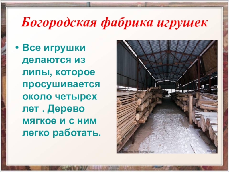 Богородская фабрика игрушекВсе игрушки делаются из липы, которое просушивается около четырех лет . Дерево мягкое и с