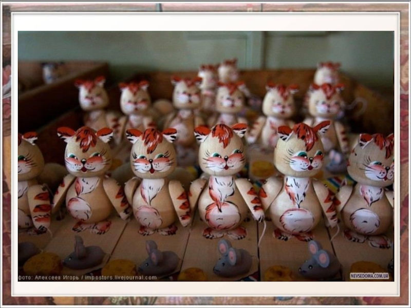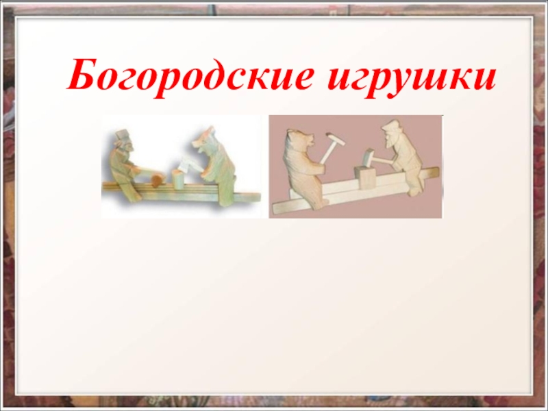 Богородские игрушки «Пёстрые деревянные курочки на подставке, фигурки кузнецов, мужика и медведя, — потяни за планку, и они застучат молоточками по маленькой наковальне… Забавные игрушки, известные на Руси с незапамятных времен, стали основным народным промыслом для