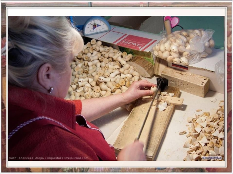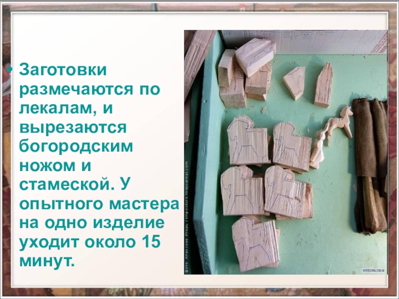 Слайд 5Заготовки размечаются по лекалам, и вырезаются богородским ножом и стамеской. У