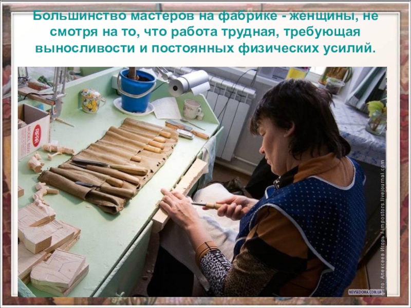 Слайд 6 Большинство мастеров на фабрике - женщины, не смотря на то, что