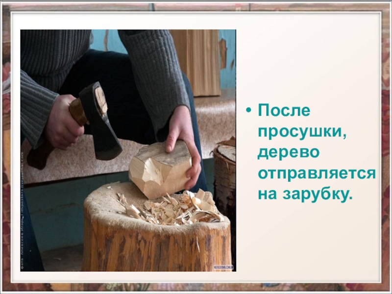 Слайд 4После просушки, дерево отправляется на зарубку.