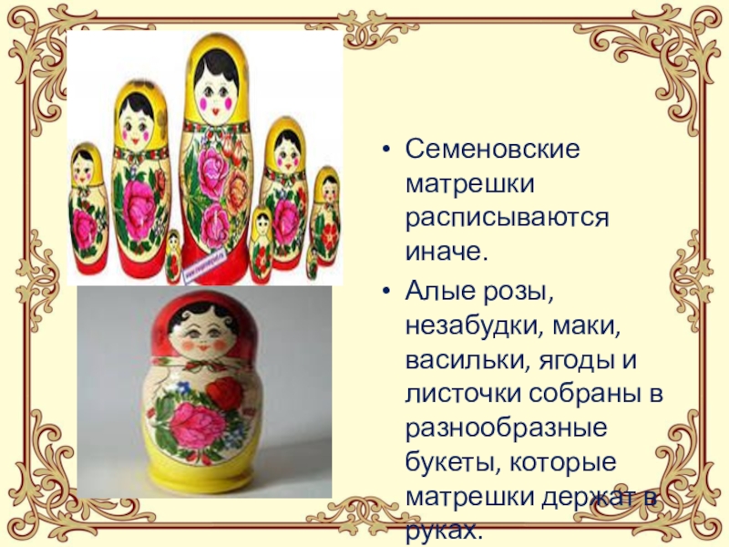Семеновские матрешки расписываются иначе.Алые розы, незабудки, маки, васильки, ягоды и листочки собраны в разнообразные букеты, которые матрешки