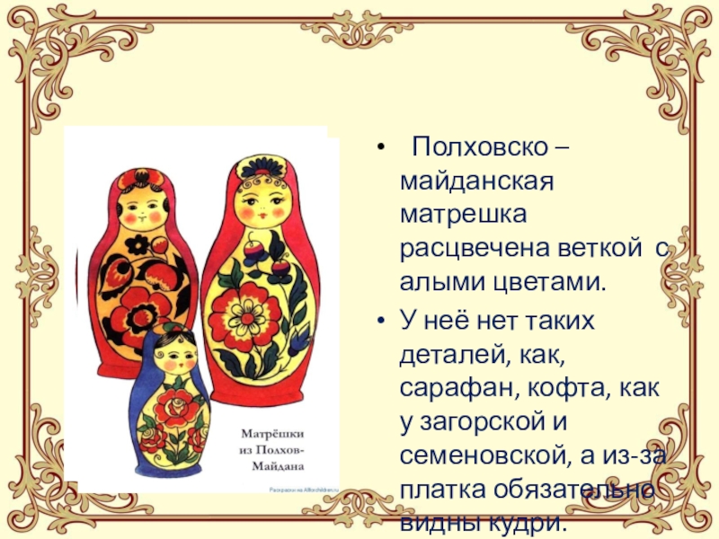 Полховско – майданская матрешка расцвечена веткой с алыми цветами. У неё нет таких деталей, как, сарафан,