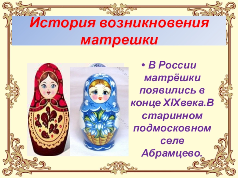 История возникновения матрешкиВ России матрёшки появились в конце ХІХвека.В старинном подмосковном селе Абрамцево.