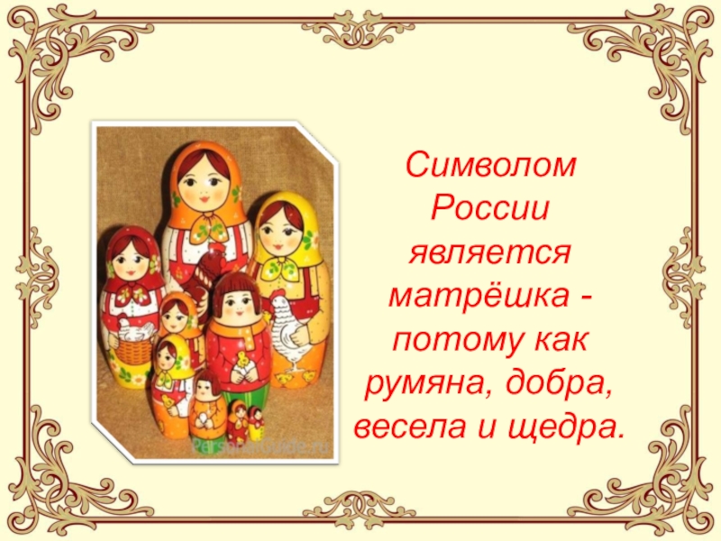 Символом России является матрёшка - потому как румяна, добра, весела и