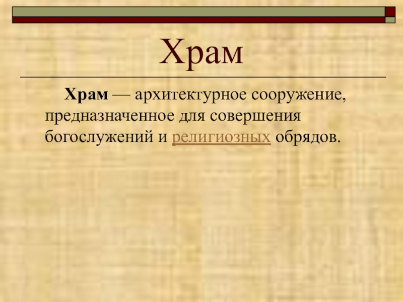 Храм — архитектурное сооружение, предназначенное для совершения богослужений и религиозных обрядов.