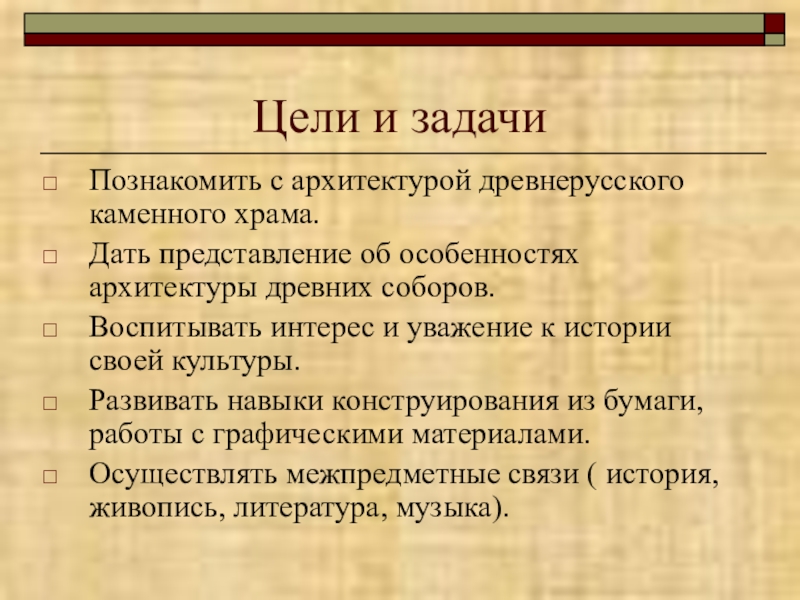 Осуществлять межпредметные связи ( история, живопись, литература, музыка).