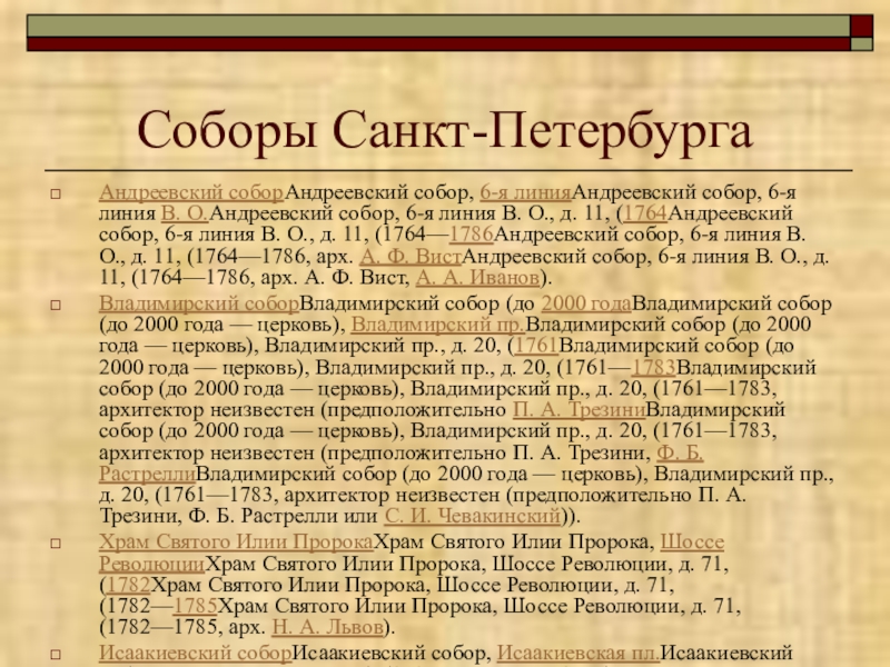 Владимирский соборВладимирский собор (до 2000 годаВладимирский собор (до 2000 года — церковь), Владимирский пр.Владимирский собор (до 2000 года — церковь), Владимирский пр., д. 20, (1761Владимирский собор (до 2000 года — церковь), Владимирский пр., д. 20, (1761—1783Владимирский собор (до 2000 года — церковь), Владимирский пр., д. 20, (1761—1783, архитектор неизвестен (предположительно П. А. ТрезиниВладимирский собор (до 2000 года — церковь), Владимирский пр., д. 20, (1761—1783, архитектор неизвестен (предположительно П. А. Трезини, Ф. Б. РастреллиВладимирский собор (до 2000 года — церковь), Владимирский пр., д. 20, (1761—1783, архитектор неизвестен (предположительно П. А. Трезини, Ф. Б. Растрелли или С. И. Чевакинский)).