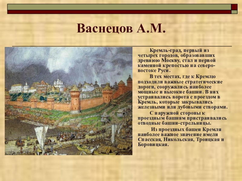 Из проездных башен Кремля наиболее важное значение имели Спасская, Никольская, Троицкая и Боровицкая.
