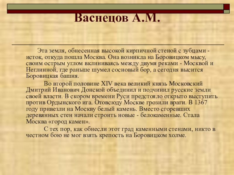 Во второй половине XIV века великий князь Московский Дмитрий Иванович Донской объединил и подчинил русские земли своей власти. В скором времени Руси предстояло открыто выступить против Ордынского ига. Отовсюду Москве грозили враги. В 1367 году привезли на Москву белый камень. Вместо сгоревших деревянных стен начали строить новые - белокаменные. Стала Москва «город камен».