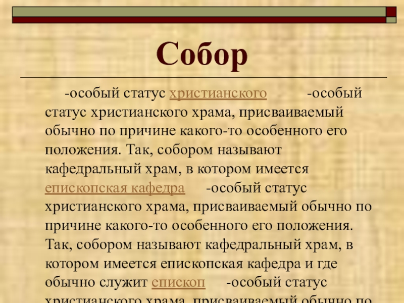особенного его положения. Так, собором называют кафедральный храм, в котором имеется епископская кафедра -особый статус христианского храма, присваиваемый обычно по причине какого-то особенного его положения. Так, собором называют кафедральный храм, в котором имеется епископская кафедра и где обычно служит епископ -особый статус христианского храма, присваиваемый обычно по причине какого-то особенного его положения. Так, собором называют кафедральный храм, в котором имеется епископская кафедра и где обычно служит епископ; в европейских языках сам соответствующий термин (англ. Cathedral, фр. Cathédrale, нем. Kathedrale) происходит от слова «кафедра».