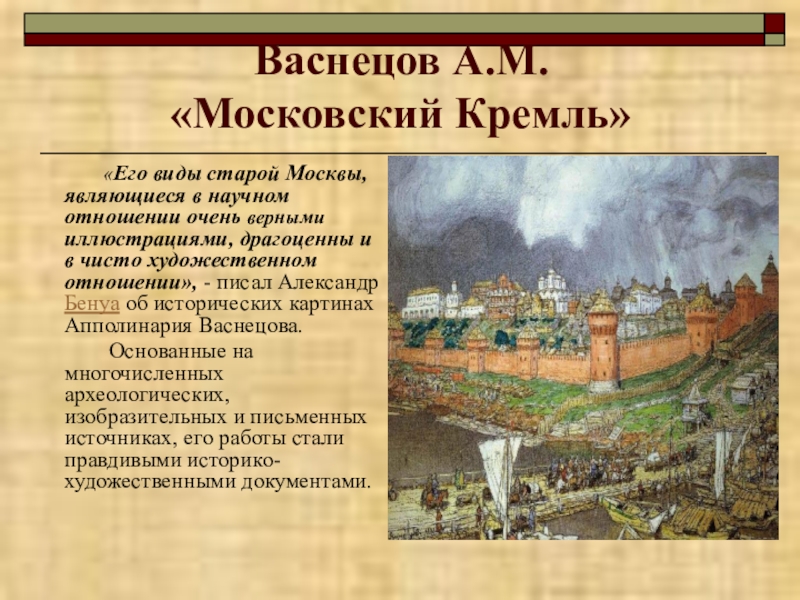 верными иллюстрациями, драгоценны и в чисто художественном отношении», - писал Александр Бенуа об исторических картинах Апполинария Васнецова.