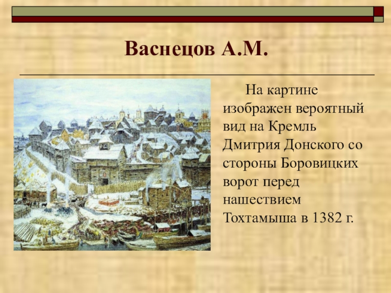 На картине изображен вероятный вид на Кремль Дмитрия Донского со