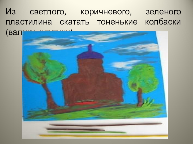 Слайд 23Из светлого, коричневого, зеленого пластилина скатать тоненькие колбаски (валики, жгутики).