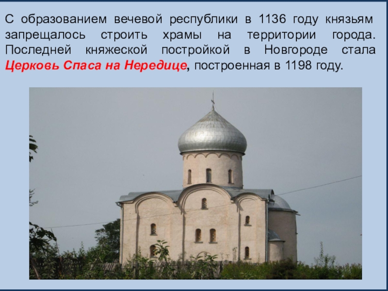 С образованием вечевой республики в 1136 году князьям запрещалось строить храмы