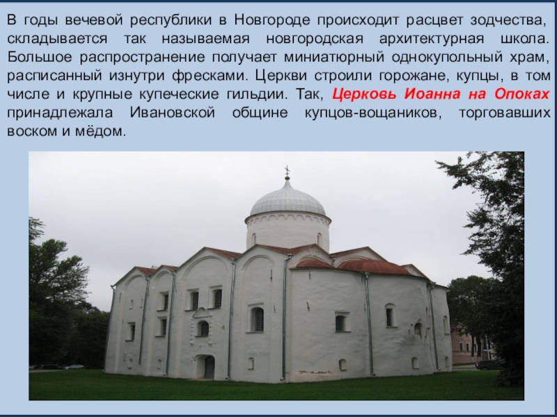 называемая новгородская архитектурная школа. Большое распространение получает миниатюрный однокупольный храм, расписанный изнутри фресками. Церкви строили горожане, купцы, в том числе и крупные купеческие гильдии. Так, Церковь Иоанна на Опоках принадлежала Ивановской общине купцов-вощаников, торговавших воском и мёдом.