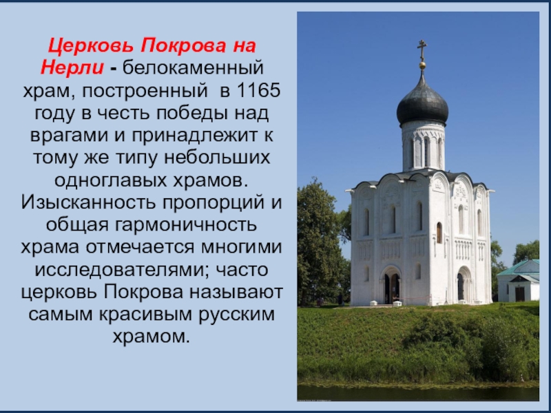 в честь победы над врагами и принадлежит к тому же типу небольших одноглавых храмов. Изысканность пропорций и общая гармоничность храма отмечается многими исследователями; часто церковь Покрова называют самым красивым русским храмом.