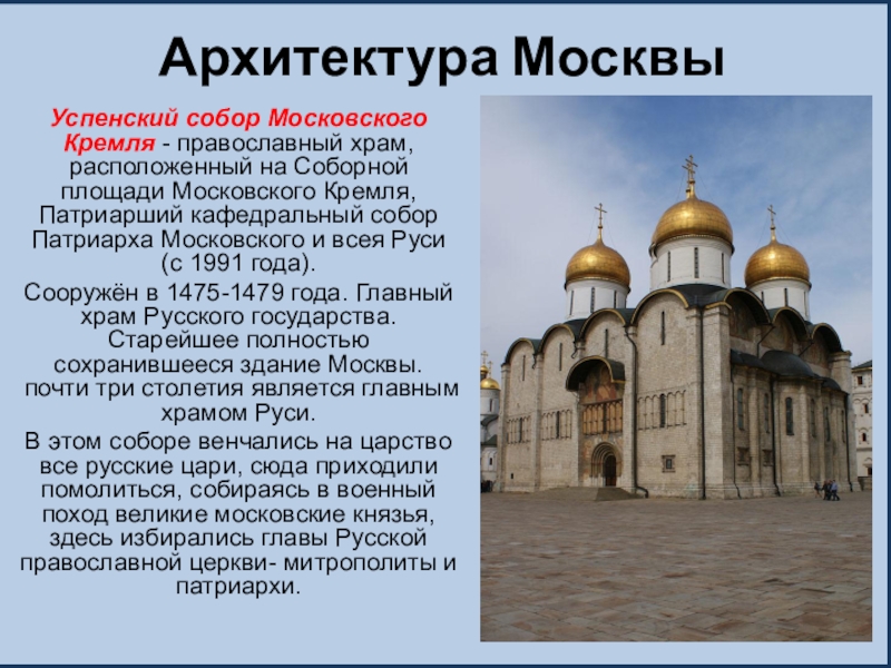 Сооружён в 1475-1479 года. Главный храм Русского государства. Старейшее полностью сохранившееся здание Москвы. почти три столетия является главным храмом Руси.