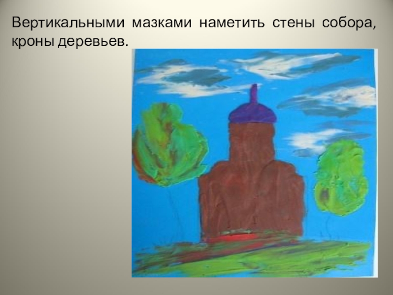 Слайд 22Вертикальными мазками наметить стены собора, кроны деревьев.