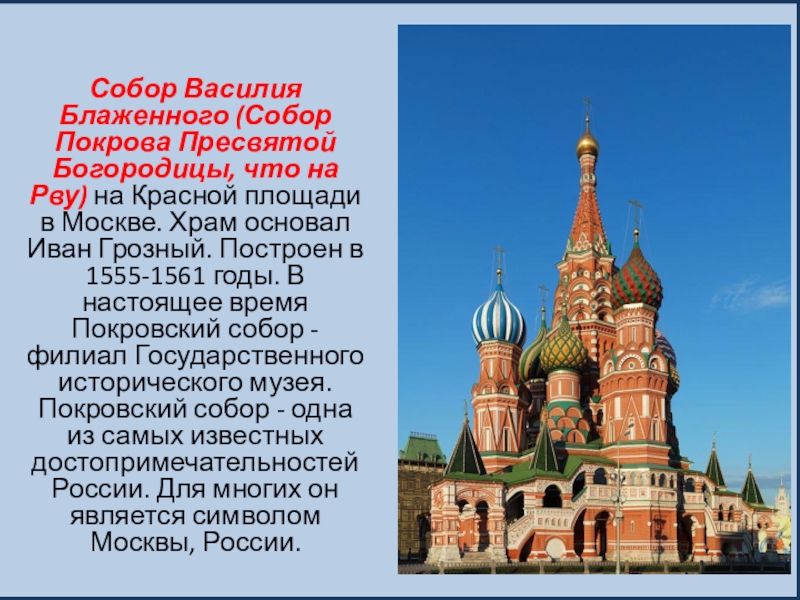 Красной площади в Москве. Храм основал Иван Грозный. Построен в 1555-1561 годы. В настоящее время Покровский собор - филиал Государственного исторического музея. Покровский собор - одна из самых известных достопримечательностей России. Для многих он является символом Москвы, России.