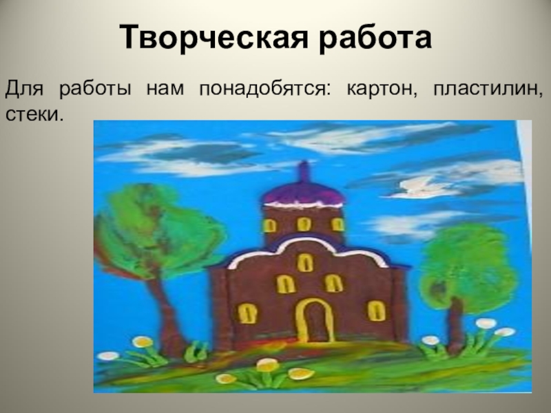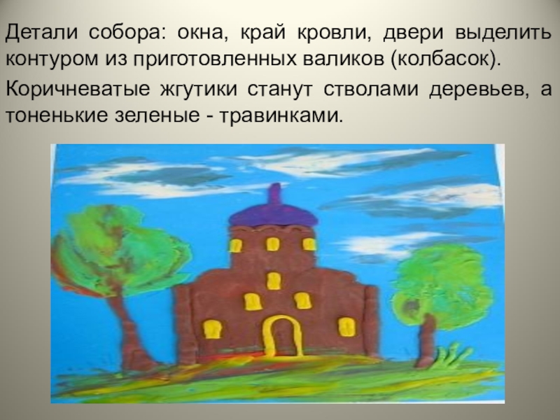 Слайд 24Детали собора: окна, край кровли, двери выделить контуром из приготовленных валиков