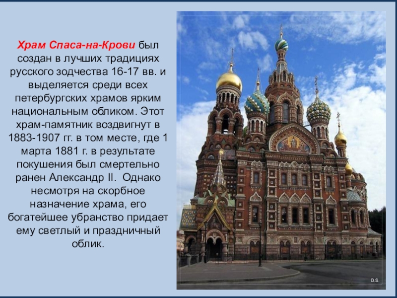 и выделяется среди всех петербургских храмов ярким национальным обликом. Этот храм-памятник воздвигнут в 1883-1907 гг. в том месте, где 1 марта 1881 г. в результате покушения был смертельно ранен Александр II. Однако несмотря на скорбное назначение храма, его богатейшее убранство придает ему светлый и праздничный облик.