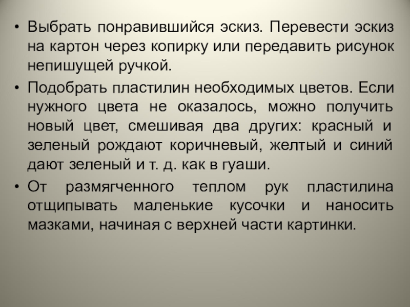 Подобрать пластилин необходимых цветов. Если нужного цвета не оказалось, можно получить новый цвет, смешивая два других: красный и зеленый рождают коричневый, желтый и синий дают зеленый и т. д. как в гуаши.