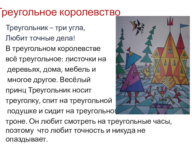 Треугольное королевствоТреугольник – три угла,Любит точные дела!В треугольном королевстве всё треугольное: листочки на деревьях, дома, мебель и