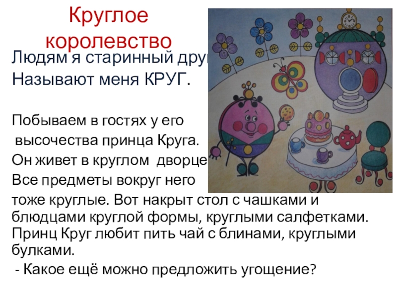 Круглое королевствоЛюдям я старинный друг.Называют меня КРУГ.Побываем в гостях у его высочества принца Круга. Он живет в