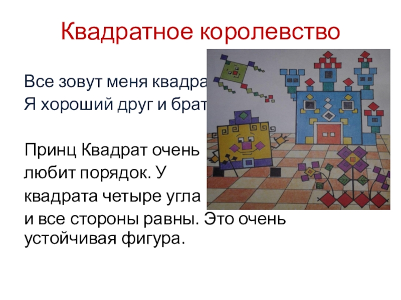 Квадратное королевствоВсе зовут меня квадрат,Я хороший друг и брат!Принц Квадрат очень любит порядок. У квадрата четыре угла