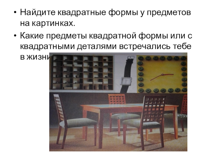 Найдите квадратные формы у предметов на картинках.Какие предметы квадратной формы или с квадратными деталями встречались тебе