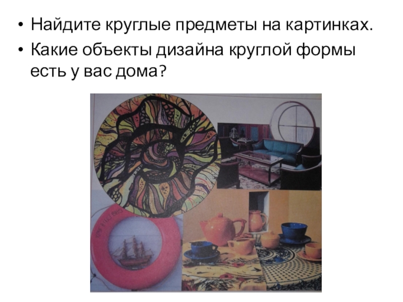 Найдите круглые предметы на картинках.Какие объекты дизайна круглой формы есть у вас дома?