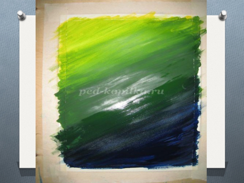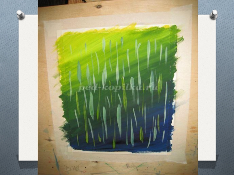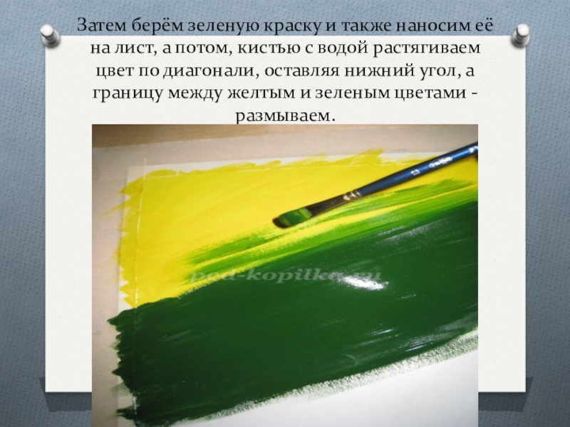 Слайд 6Затем берём зеленую краску и также наносим её на лист, а
