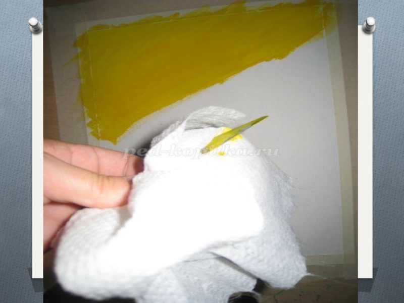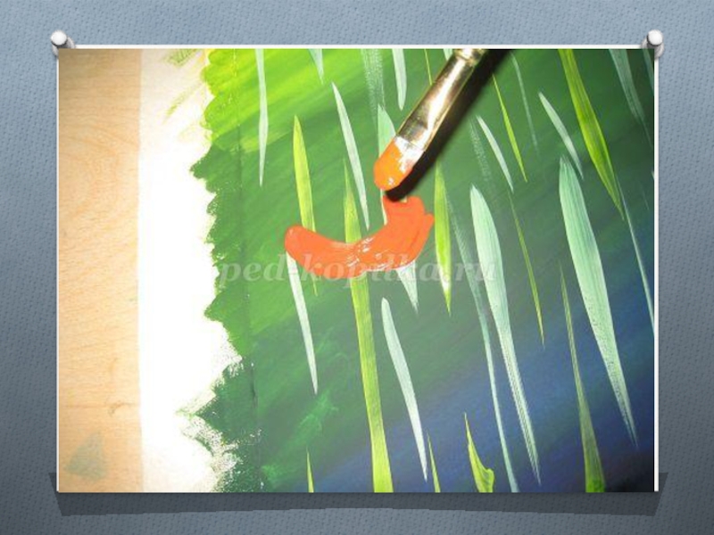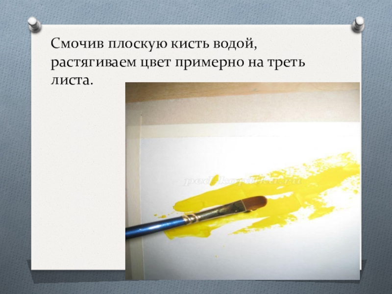 Слайд 4Смочив плоскую кисть водой, растягиваем цвет примерно на треть листа.