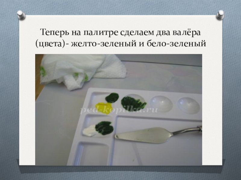 Слайд 9Теперь на палитре сделаем два валёра (цвета)- желто-зеленый и бело-зеленый