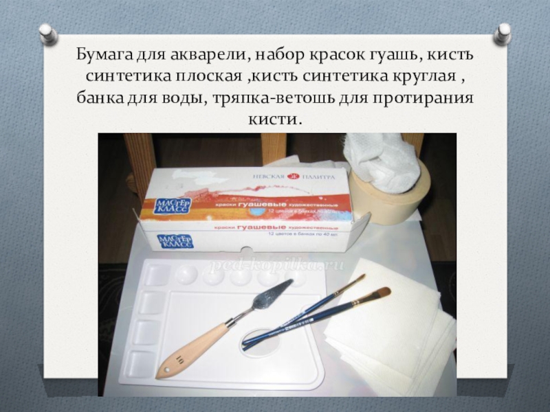 Слайд 2Бумага для акварели, набор красок гуашь, кисть синтетика плоская ,кисть синтетика