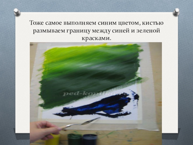 Слайд 7Тоже самое выполняем синим цветом, кистью размываем границу между синей и