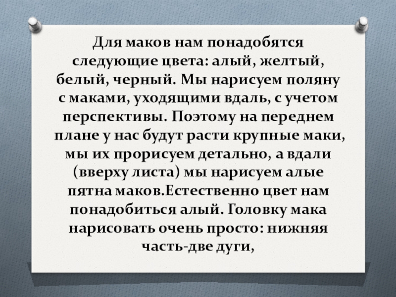 Слайд 12Для маков нам понадобятся следующие цвета: алый, желтый, белый, черный. Мы